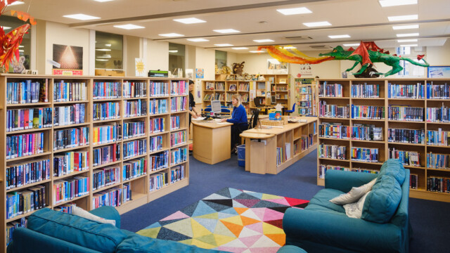 The library is designed to be a welcoming, comfortable space where students can escape the bustle of the school day to focus and reflect.